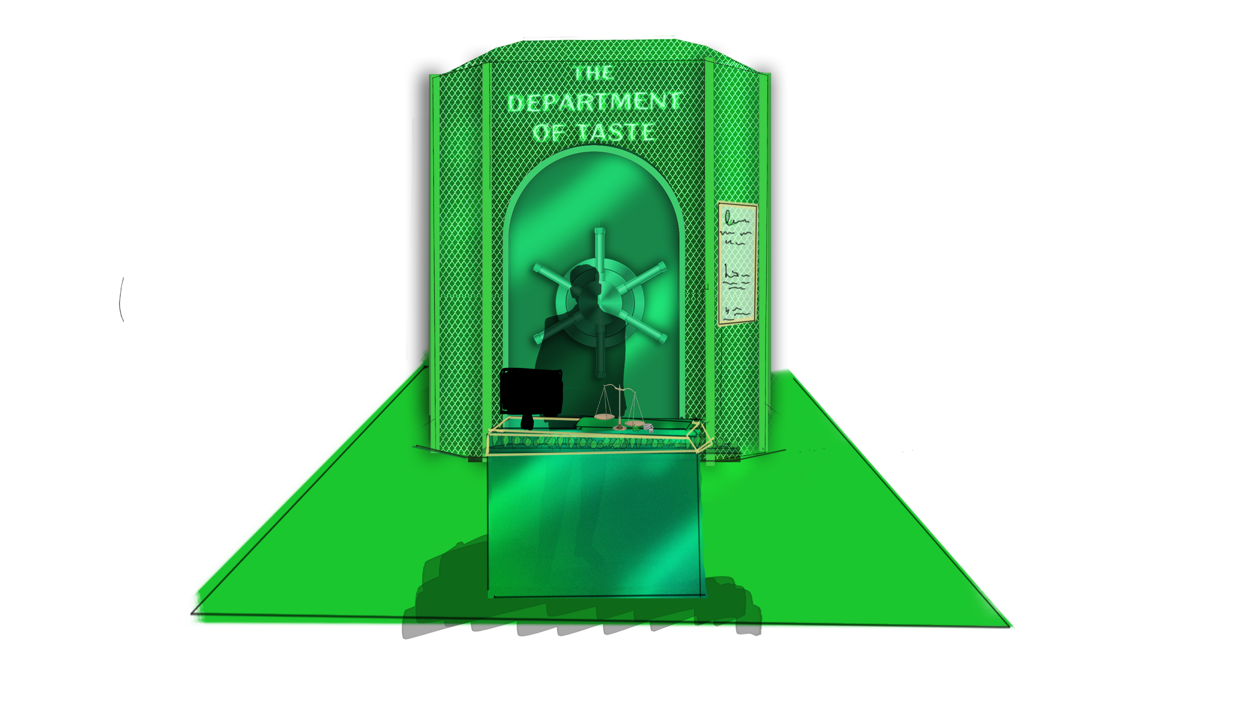 A freestanding column standing proud. To the centre at the front is a glass window with a vault door where guests were able to place their emerald on a Perspex plate and watch the laser lights dance over it.